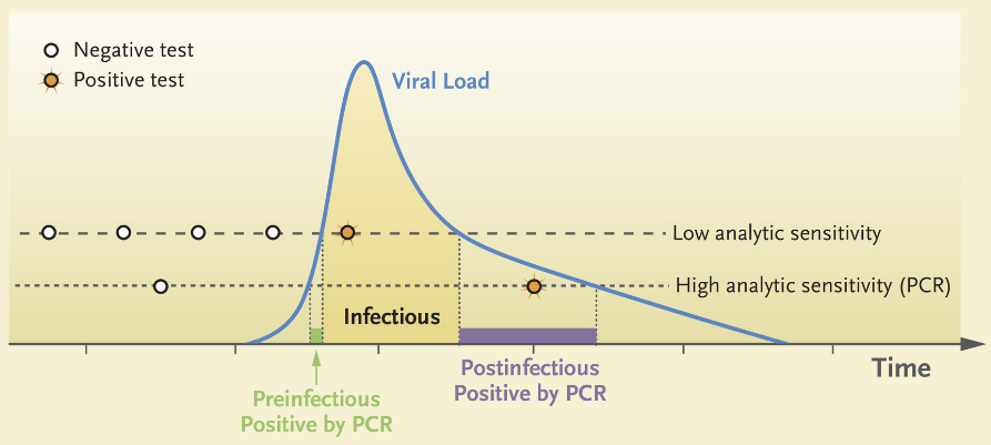 In der Grafik wird dargestellt, dass die Übertragbarkeit des Erregers SARS-CoV-2, in direktem Zusammenhang mit der Höhe einer Viruslast einem zeitlichen Verlauf unterliegen würde. Und sie sagt aus, dass es Phasen gäbe, in welcher Menschen auch ohne Symptome die man Covid-19 zuschreibt, diese Viren übertragen könnten — nur mit sehr viel geringerer Wahrscheinlichkeit. Würde man den PCR-Test mit weniger Zyklen fahren (Low analytic sensitivity) würde das durch weniger “Positive” zu realistischeren Ergebnissen hinsichtlich der Infektiösität führen, weil ja so die “Asymptomatischen” (“Preinfectious” und “Postinfectious”) nicht mehr mitgezählt würden.
